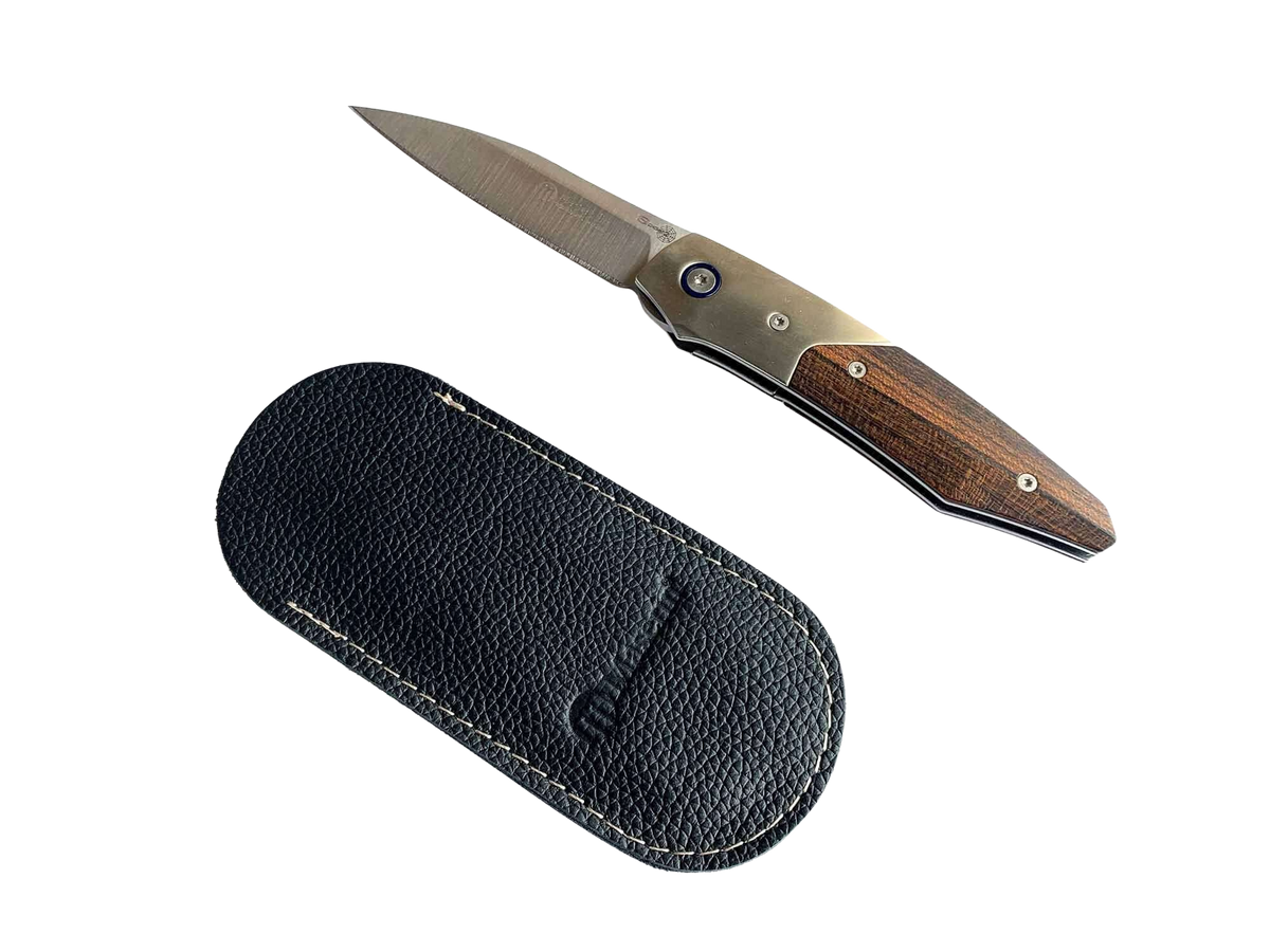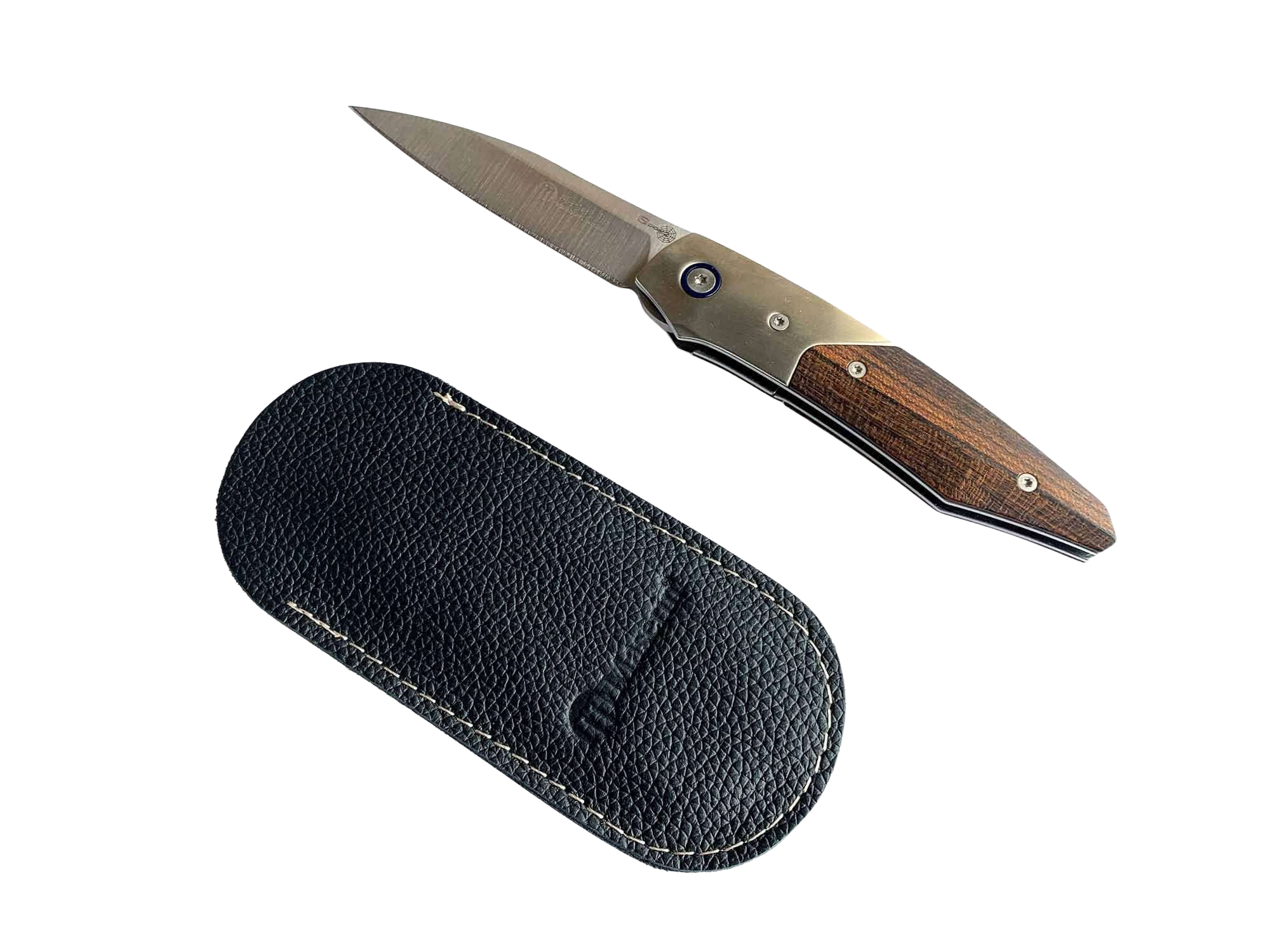 Impugnatura in acciaio e legno di bocote, ergonomica e stabile. Sistema di blocco Liner Lock per utilizzo sicuro durante le attività outdoor.